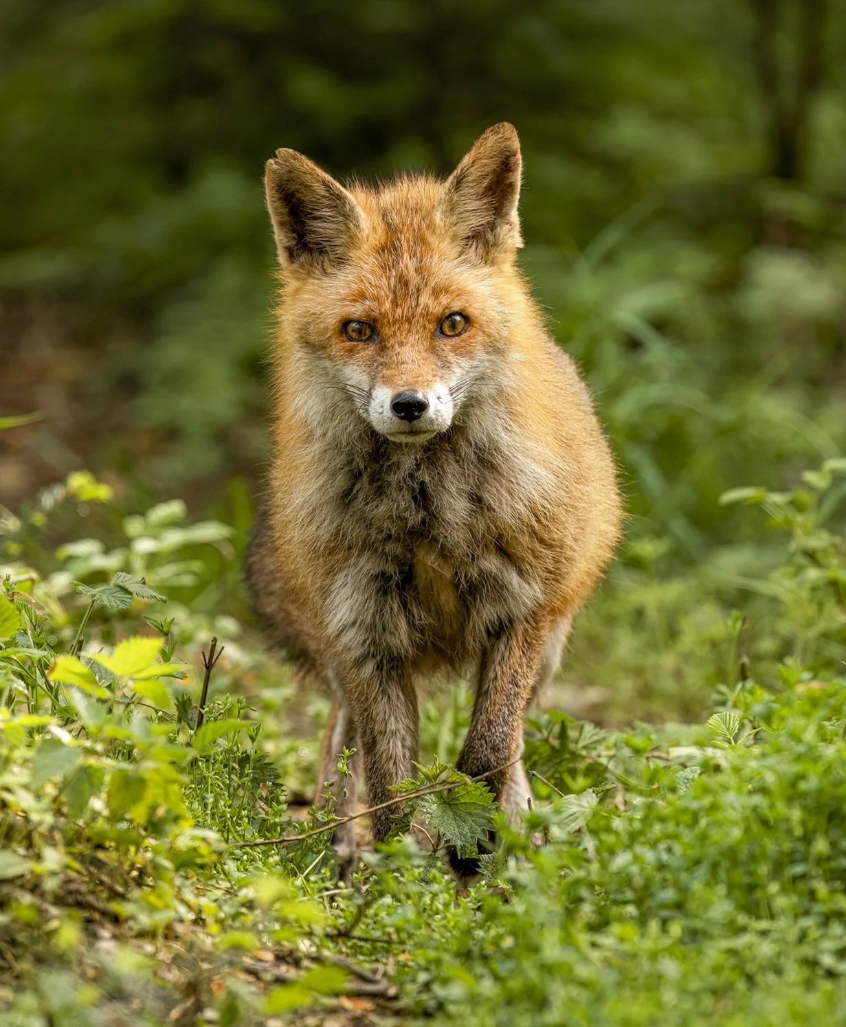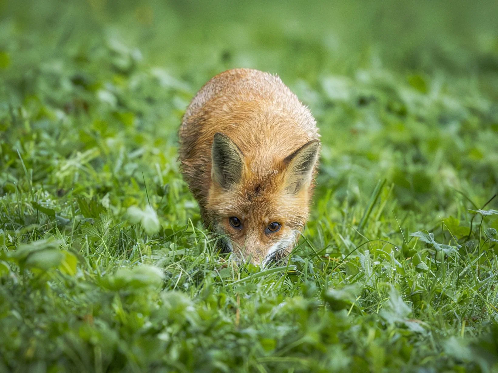 A fox walking through green grass, with its head close to the ground as if stalking or sniffing.