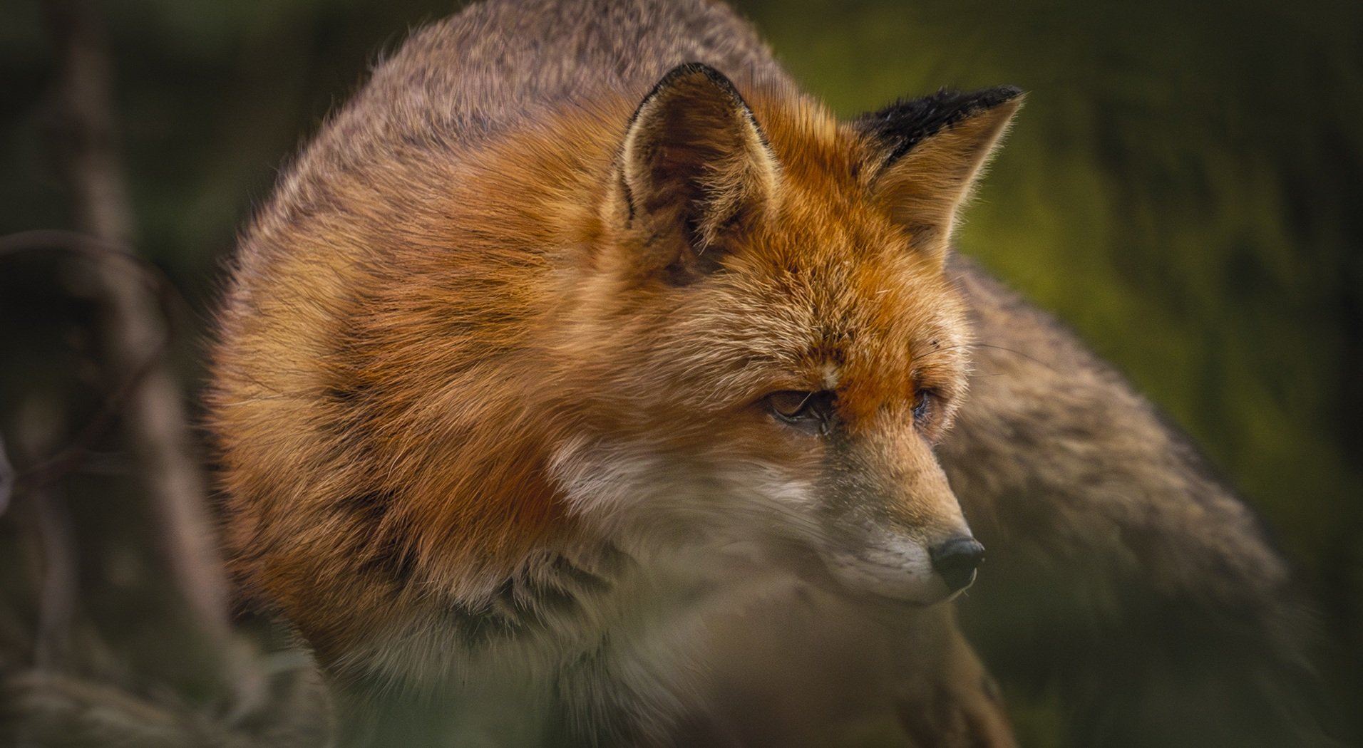 A close-up of a fox in a natural environment, with orange and brown fur, looking downward with a focused expression.