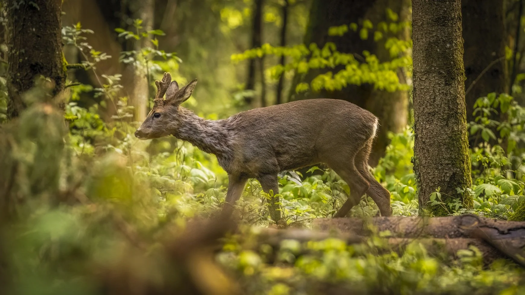 A young deer with small antlers walking through a forest with green foliage and trees.