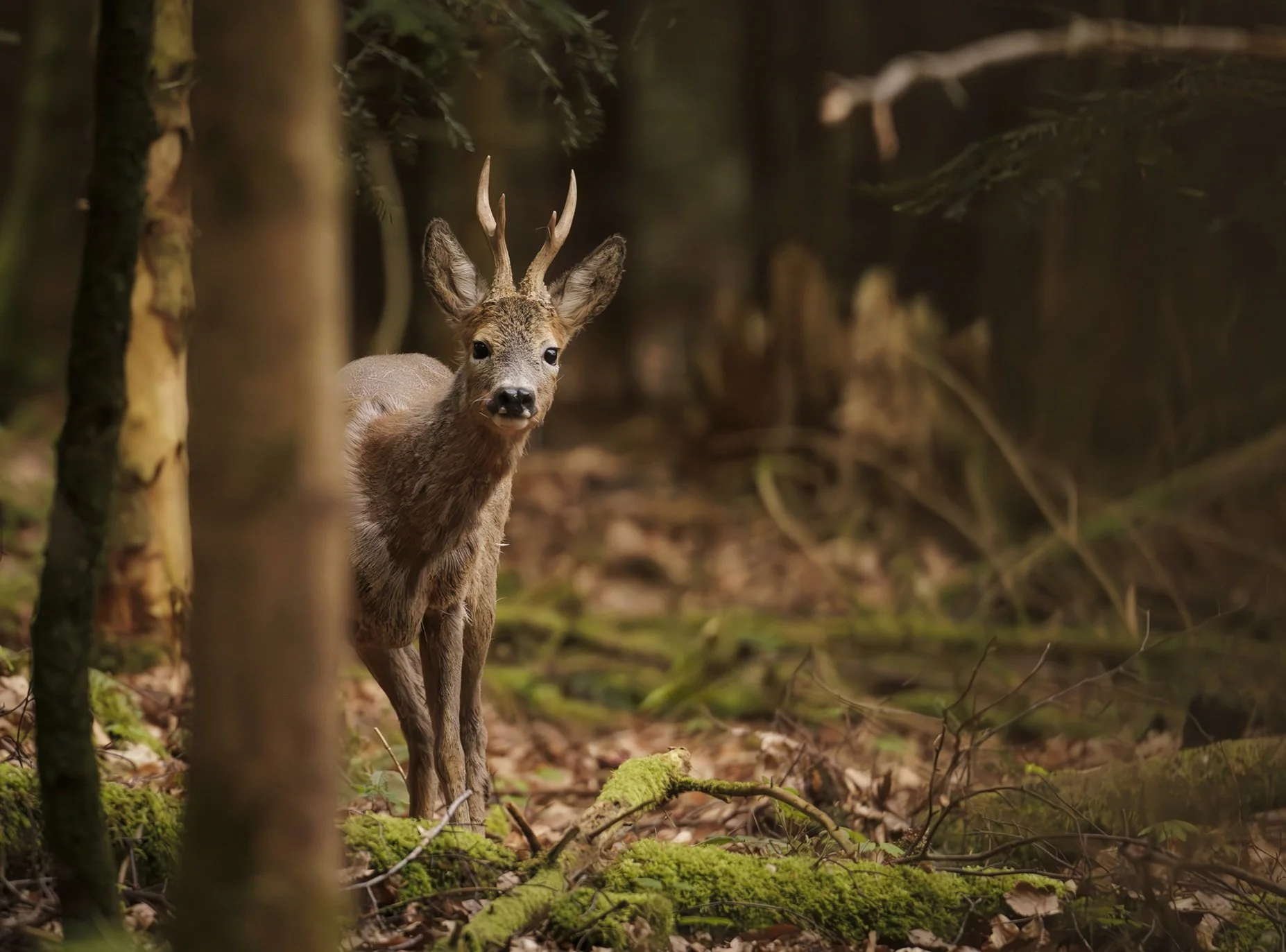 A young deer with antlers standing in a mossy forest, looking directly at the camera.